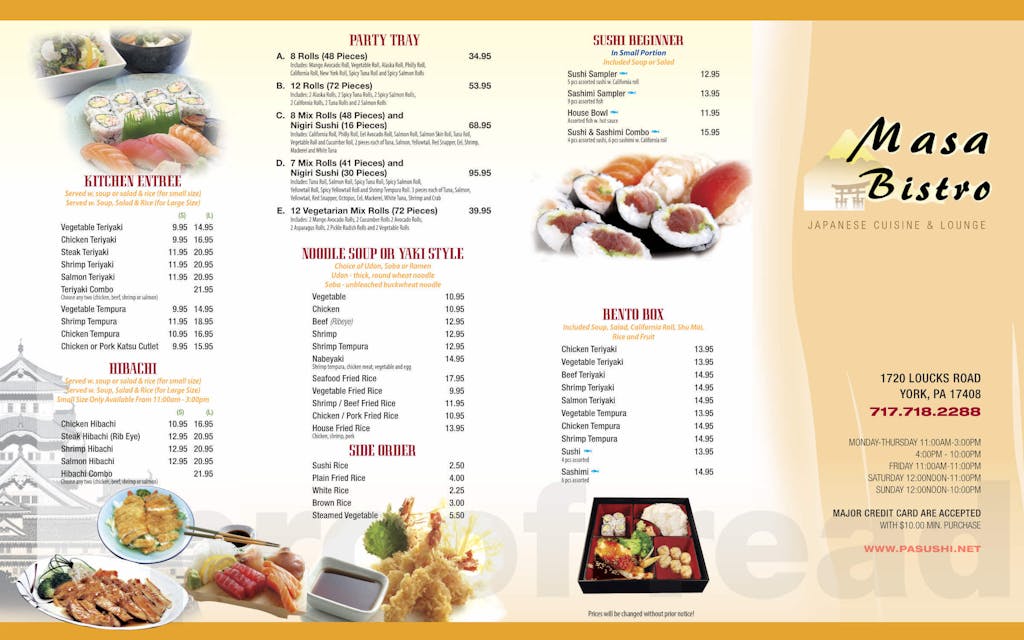 Welcome to Masa in York, Pennsylvania where we serve Japanese cuisine such as Sushi Rolls, Seafood Fried Rice, Salmon Teriyaki, and Bento Boxes. We're located near West Manchester Town Center on Loucks Road. Order online for carryout or delivery!